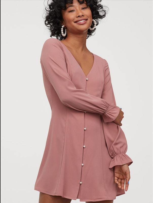 Ніжна легка сукня з креп шифону, виглядає вишукано і стильно. З V-подібним вирізом, гудзиками спереду і довгими рукавами з вузькою гумкою і оборкою на манжетах. Вузька талія і трохи розкльошена спідниця. Без підкладки.