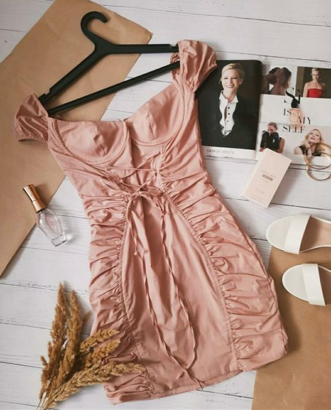 Нежное пудровое платице, украшено сборочками по бокам и шнуровкой. Платье абсолютно новое, но бирочка срезана. Размер 8. Полуобхват груди - 35 см. Полуобхват талии - 29 см. Полуобхват бедер - 44 см.