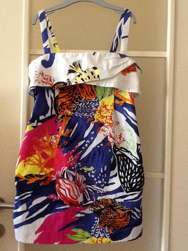 Яркое оригинальное платье из хлопка. Сзади на молнии. В боковых швах- карманчики. Внучка выросла. Замеры: ПОГ= 42-43 см. Вся длина- 79 см., полуобхват по низу- -49,5 см. Плотный хлопок.