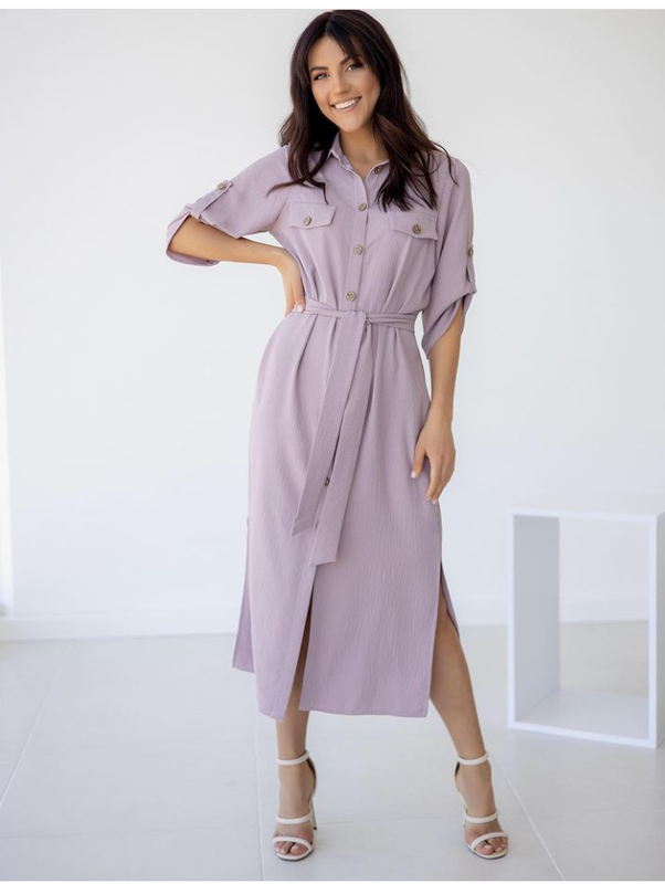 Сукня-сорочка - ідеальний варіант на літо. Тому що вона поєднує в собі ніжність і чарівність сукні, а також комфорт і практичність сорочки. Виріб вільного силуету з розпірками з боків. Модель з акуратним стоячи-відкладним коміром, застібка на планку з маленькими гудзиками. Поличка декорована клапанами з гудзиками. Рукав до ліктя з патою і ґудзиком. В комплект входить пояс з основного матеріалу. Така модель буде чудово поєднуватися з різними варіантами взуття та аксесуарів.