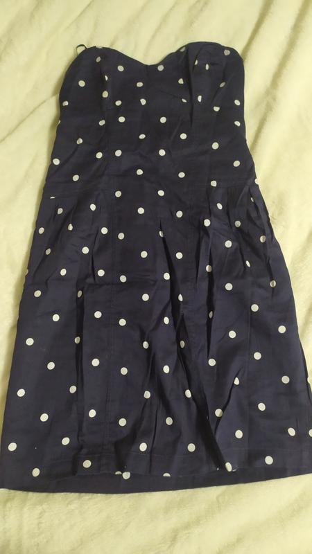 Літнє легке плаття з відкритими плечиками в білий горошок, темно-синій колір, лягає по фігурі.