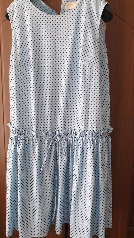 Легке літнє плаття,нежноголубого кольору в горошок, по коліно.Одягалось два рази,одне прання.Довжина 96,пог 52+виточення,відрізне 52 від плеча,стегно вільний)