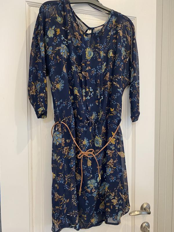 Продам нову неймовірну сукню Orsay. Розмір 40, підійде на М. Французький стиль, неймовірно пасує зі шкіряною курткою і ковбоями. Нова, куплена в офіційному магазині, без бумажноі бірки. Залишилася пломба з поясом , видно на фото. Сукня прозора , темно синього кольору з квітами, підкладка темно синя ,пояс на резинці, додатково завязується на шкіряний поясок. Застібка ззаду ґудзик . Тканина поліестер. Продам за 250 грн. Вишлю поштою після оплати на карту . Примірок , обмінy, повернення немає.