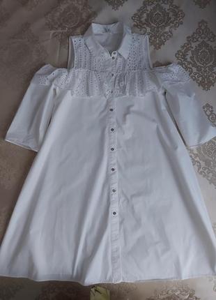 Очень красивое платье свободного кроя с открытыми плечами. Верх и рюша -прошва. Рукав 3/4. Из дефектов-потерялась одна пуговка, снизу. Не заметно.