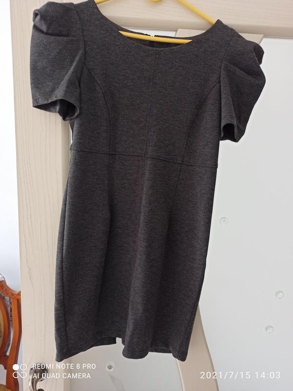 Плаття-міні, графітового кольору, приємний матеріал, фігурні рукави, застібка замок на спині. На бірці вказано 10 розмір, дам заміри, гарно сідає по фігурі.