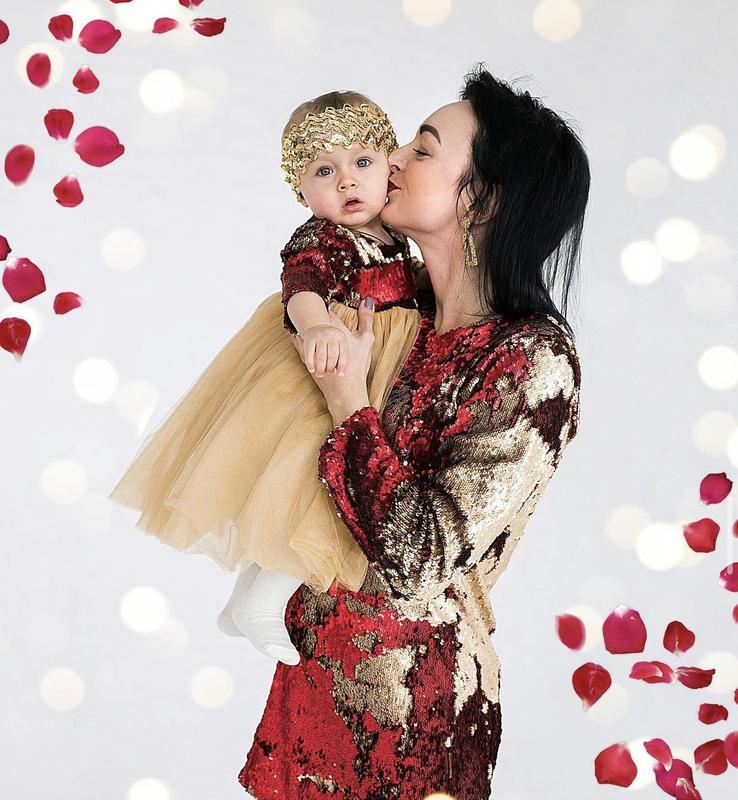 Фемели лук мама и дочка на годик Платья расшиты двухсторонней пайеткой красный+золото. Размер мамы М, но на фото одеты даже на хс (свободный крой, рукав 3/4) Ширина по плечам 40, длинна 80 см Туфлі та заклики додаю у подарунок