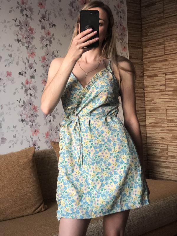 Сукня на запах,бретелі що регулюються,на талії тонкий пояс. Розмір М.Напівобхват талії 37 см.Напівобхват грудей 40 см.