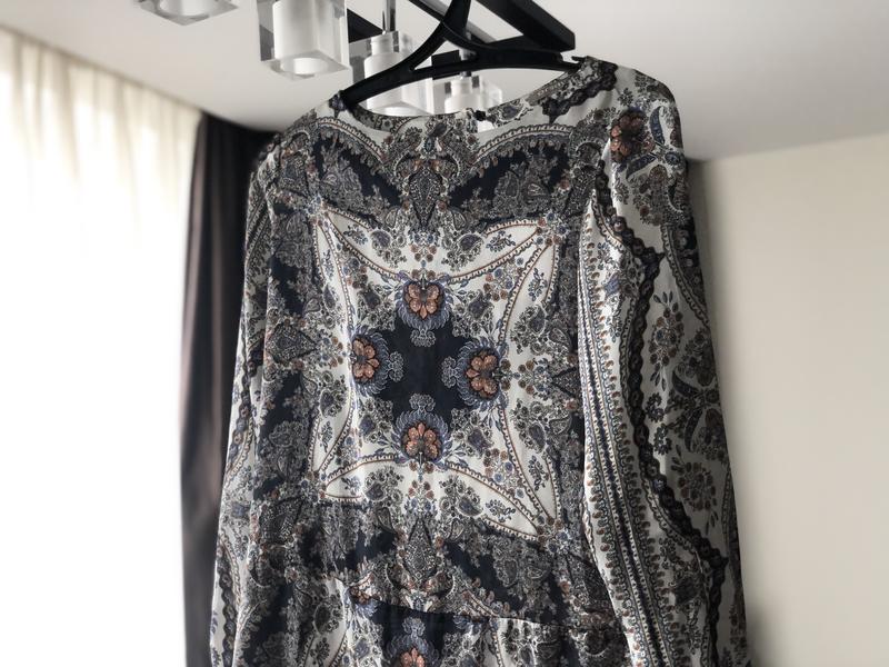 Супер легке, після стірки можна не гладити . Трошки світиться . Класне поєднання темно синього з світлими кольорами.можна одягати , як плаття або, як туніку . Є шльовки на пояс. На вечір просто шик !