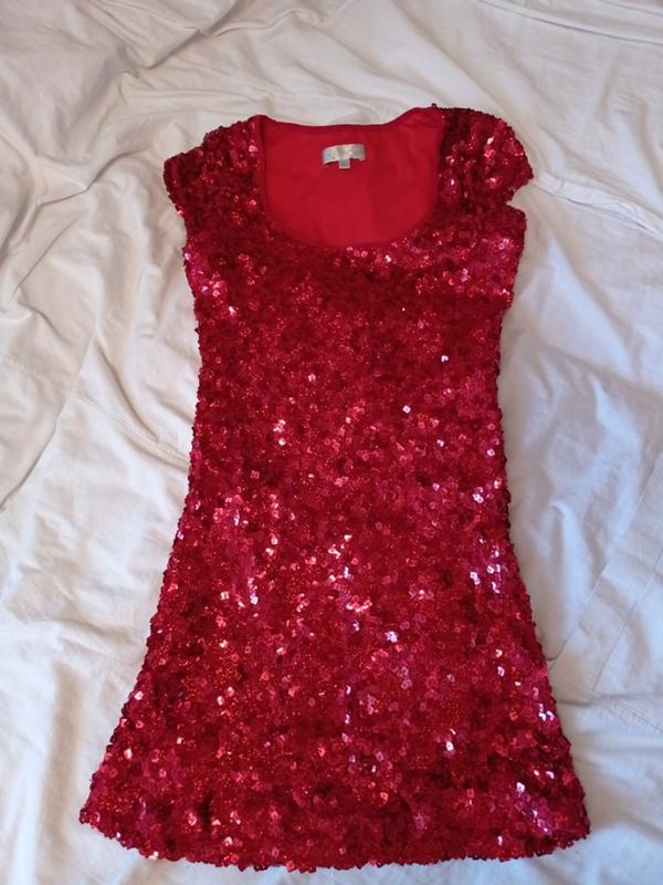 короткое платье красная паетка. р 42-44 . красивое декольте, обалденно блестит, дорого смотрится длина 78