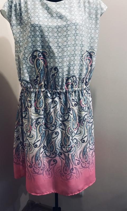 Летнее платье на подкладке, талия резинка. Размер указан 46/48 Состояние идеальное, дефектов нет Длина от плеча до талии 41 см, от талии до низа 56 см, общая длина 97 см, ПОГ 58 см, ПОТ резинка 48-58 см тянется, ПОБ 72 см.