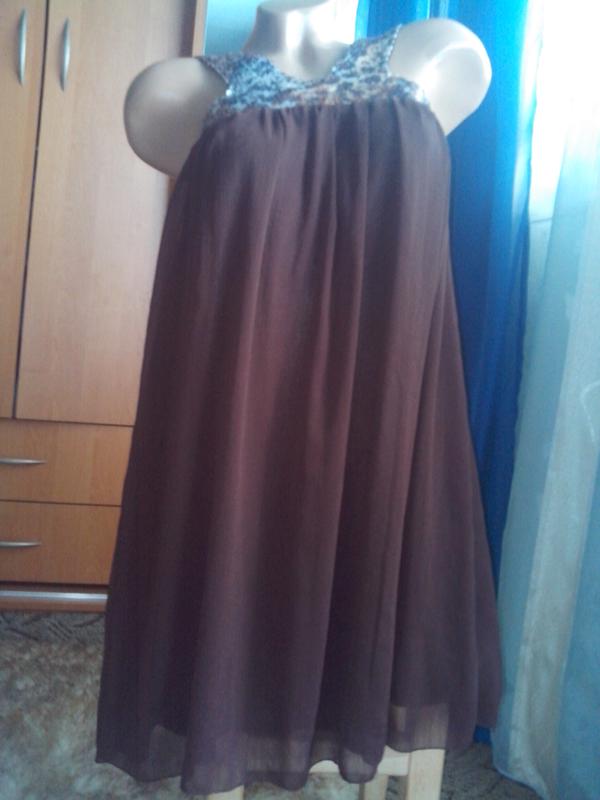 Красивого шоколодного цвета шифоновое вечернее платье, украшено золотисто-серебряными паетками, фасон "балахон", свободное, полностью на подкладе. Размер указан 8, наш 42, замеры: длина вместе с бретелями 85 см, ПОГ 42 см, ПОТ и ПОБ свободно. Ткань, состав: верх шифон 100% полиэстер, оочень лёгкий, невесомый; подкладка 100% вискоза, приятнейшая к телу, нежная и отлично тянется! Бренд - Zuppe. Сток, в идеальном состоянии. Спрашивайте, пожалуйста, оочень изысканное, лёгкое и просто красивое платье! Доставка УП ( + 25 грн. ) или НП;-)...