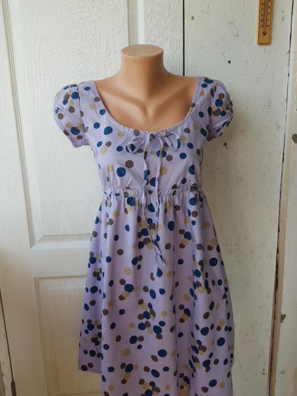 Стильное,хлопок 100%,пышый низ,рукава присобраны,принт-горохи.Длина-88-89см,ПОГ-42-44см,ПОТ-36-38см,в бедрах-свободно.Бирки с размером нет.Р-р XS-S.