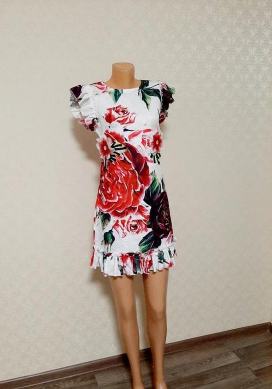 ♥️Дуже красиве оригінальне плаття декороване квітами з стразами на плечах і внизу шифонова рюша. Ззаду на всю спину потайна блискавка ♥️ Розмір: М 42-44 Виміри: ПОП-35 ПОГ-44 ПІТ-43 ПОБ-52 Довжина виробу-86 Склад тканини: 65% бавовна 35% polyester