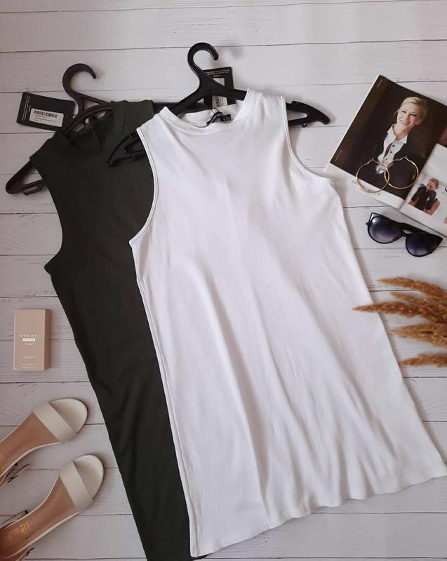 Трапецевидное платье под горлышко, без рукавов, расширяется к низу. Цвет белый - размер 8, ПОГ - 43 см., ПОТ - 44 см., ПОБ - 48 см., длина - 79 см. Цвет белый - размер 14, ПОГ - 49, ПОТ - 50 см., ПОБ - 54 см., длина - 85 см. Цвет хаки - размер 10, ПОГ - 44 см., ПОТ - 46 см., ПОБ - 49 см., длина - 83 см.
