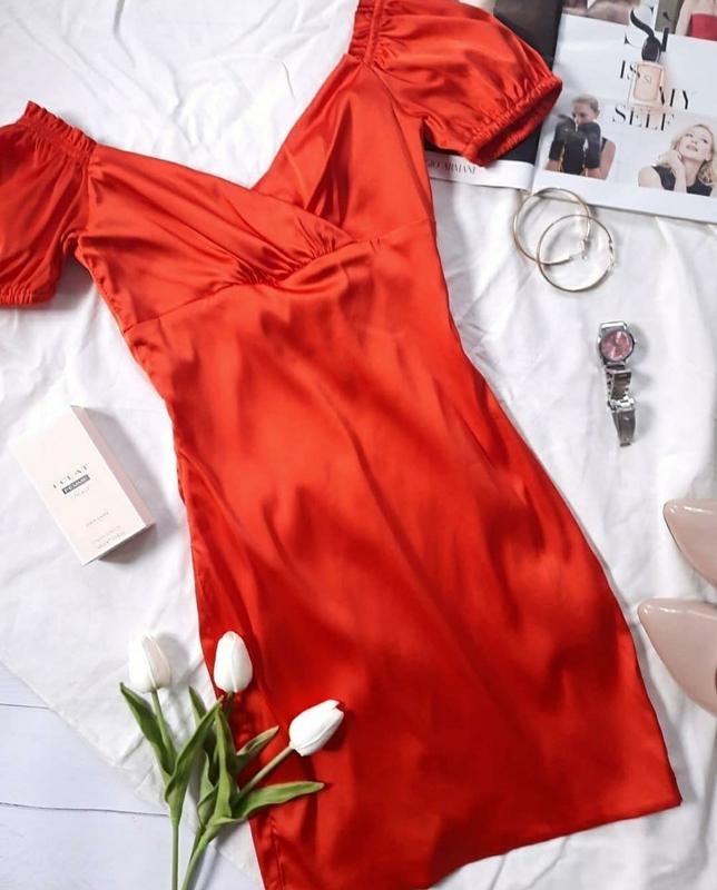 Милое атласное платье, красивого цвета, с интересным декольте и коротким рукавчиком. Размер 4. Полуобхват груди - 31 см. Полуобхват талии - 27 см. Полуобхват бедер - 38 см. Платье новое, но без бирки.