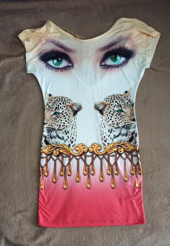 Короткое платье. Спереди глаза в стразах,сзади по спине цепочка. Очень приятное к телу. Турция.
