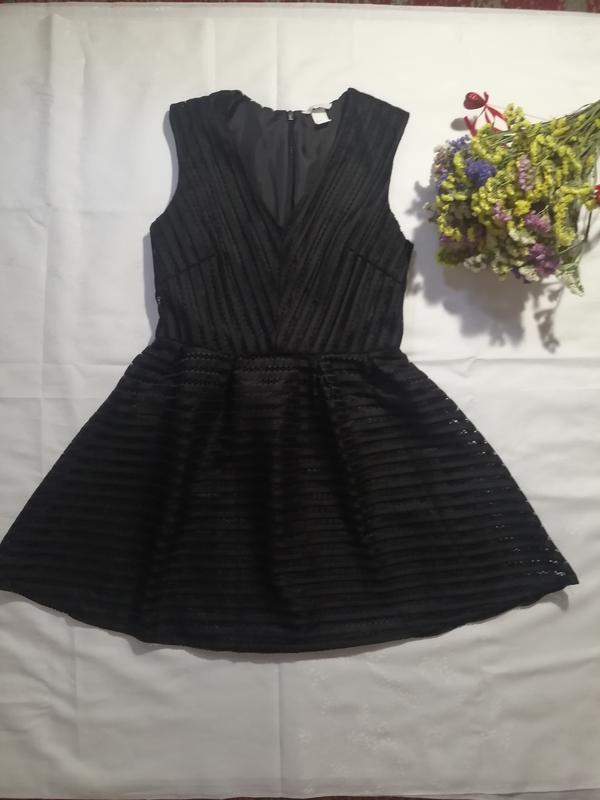 Чорне плаття H&M зі спідничкою, яка тримає форму, на підкладці, яка не просвічує. Ззаду має замок від горловини до лінії стегон ЗАМІРИ: ОГ - 92см ВІД – 80см ПРО – вільно (до 124см) Довжина – 87 див. Розмір 42/12, але краще орієнтуйтесь на заміри. Склад: 100% поліестр