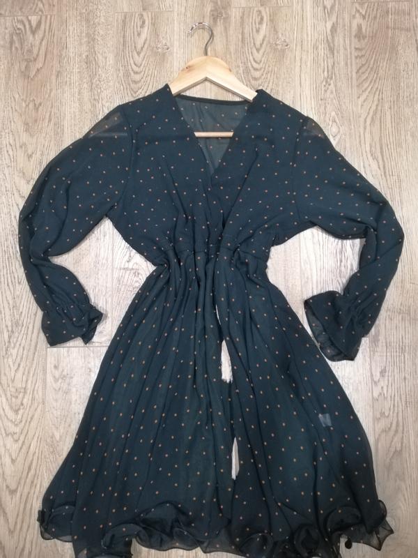 Платье темно-зеленого цвета в мелкий оранжевый горошек. Имитация "на запах" с поясом-канатом
