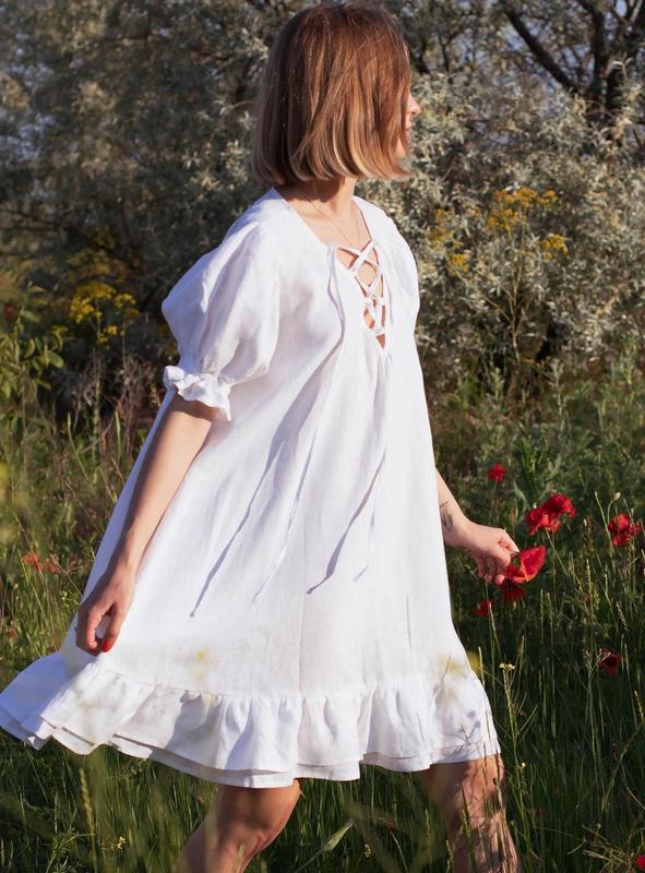 ⚡️Платье мини свободного кроя с короткими рукавами-фонариками и шнуровкой на груди стиле бохо⚡️ LOT 697 Льняное облако нежности и женственности💙 ▪️Материал: сертифицированный 100% лен премиум качества европейского производства ▪️Длина: 90 см, ПО за плечами - 39 см, ПОГ - 60 см ▪️Цвет: альпийский снег ▪️Размер: one size (42-48) По желанию возможен отшив в любом размере и длине! ☝Отправка по Новой почте по предоплате: 250 грн+накладная✈️ ☝БЕСПЛАТНАЯ ДОСТАВКА по полной предоплате: ждать отправку 2-5 рабочих дней✈️ ☝Есть обмен/возврат в течение 1 дня с момента получения посылки! ☝Способ оплаты: На банковскую карточку (включая комиссию) Реквизиты отправляем в чат!