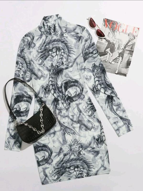 Женское платье-мини Выполнено из белой ткани-сеточки с принтом: китайский дракон Размер:М