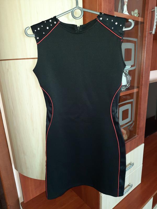 Чорна сукня в хорошому стані. Розмір S. Плечики оздоблені камінцями (декілька камінчиків випало, є на фото, при носці не помітно). По боках вставка з червоним кантиком.