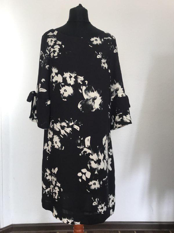 Черное платье с белыми цветами от H&M. Силуэт немного расклешенный к низу, рукав 3/4, украшен завязками, сзади застегивается на одну пуговицу, на подкладке. Новое, без бумажной бирки. Подойдет на размер S (бедра - S/M). Замеры вышлю по запросу