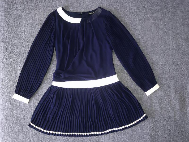 Акция! При покупке от 3-х единиц товара – скидка 10% на самую дорогую вещь. Нарядное короткое оригинальное платье с плиссированными рукавами и юбкой. Платье с заниженной талией, сзади до талии на молнии. Платье очень легкое и воздушное, основная ткань полупрозрачная, поэтому платье на подкладке (кроме рукавов). Нарядности платью добавляют золотые пуговки на манжетах рукавов и белые атласные вставки на горловине, талии, манжетах, юбке. Длина платья - 86см, плечи - 40см, длина рукава - 65см, объем груди - 94см, объем по белому поясу - 96см.