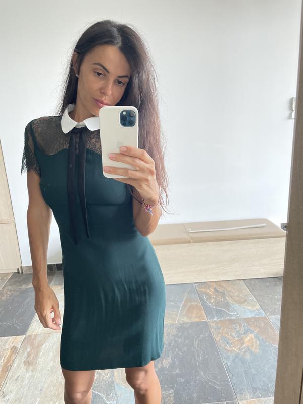 Платье комбинированное из кружева и ткани. Цвет зелёный с белым воротником и чёрными завязками. Сзади на молнии. Размер xs