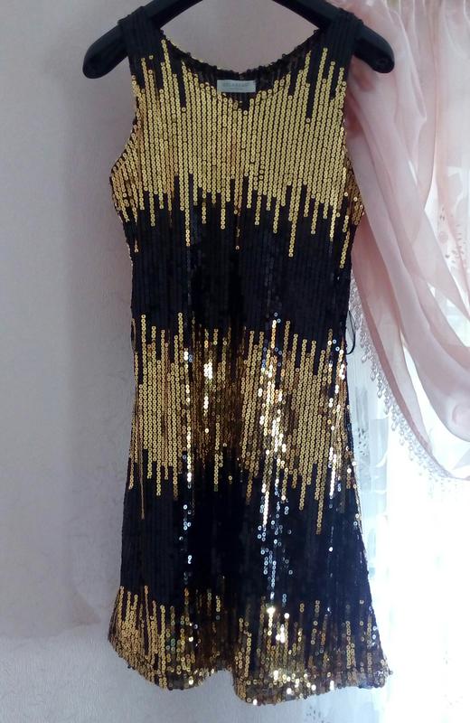 На зростання 154, дуже красиве і блискуче, естьтончайшая підкладка сіточка. Відливає синім іноді, але паєтки чорні. Відливає Дефект: знизу трохи повылазила волосінь, на якій тримаються паєтки (4 фото).