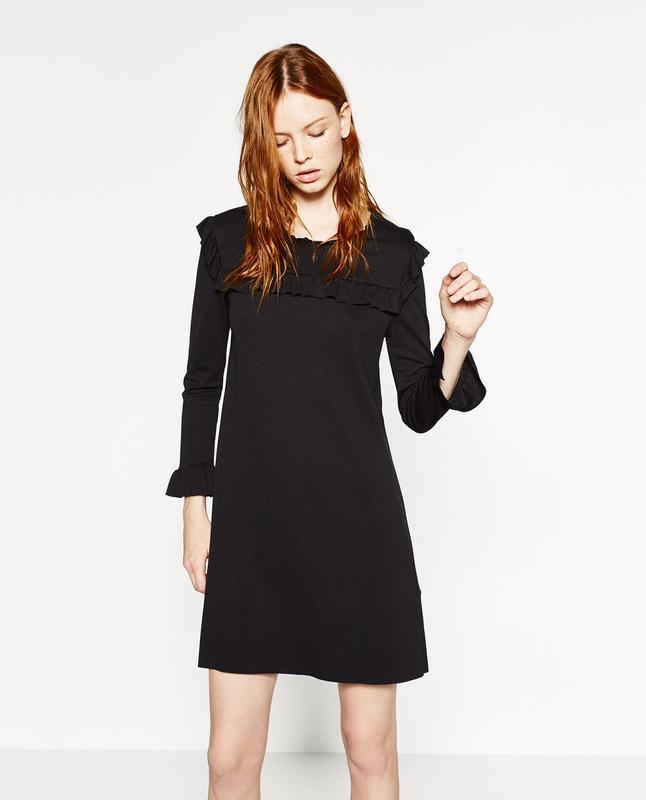 Гарне та тендітне mini плаття zara, виконане з віскози, гарний щоденний варіант, дуже м‘яке та приємне до тіла. Колір насичено чорний. Модель не приталена. Розмір с-м. Має стан нової речі. Півобхват під мишки у звичайному стані -46.47 см Плечі - 37.38 см Рукав з рюшом типу три чверті 149.50 см Бедра півобхват -53 см+ тянеться/зауважу що плаття трішки трапецевидне як на моделькі Довжена - 84 см