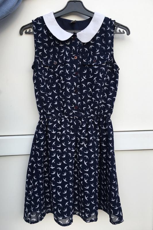 Ніжне платтячко, розмір ХС, на ріст 152 см Стан дуже хороший, один недолік, трішки пожовтів комірець з внутрішньої сторони (думаю вистірається) а так все добре. Заміри: Плечі від шва до шва 32 Талія 29 (на резинці, тягнеться до 42) Довжина 77