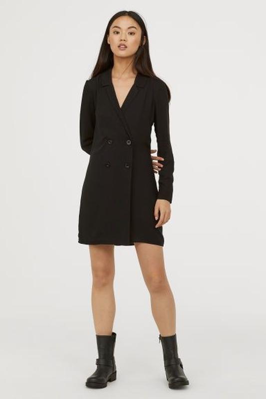 Двубортное платье из плетеной ткани. Зубчатые лацканы, V-образный вырез, длинные рукава и потайная молния сбоку. Без подкладки. Вискоза 100%