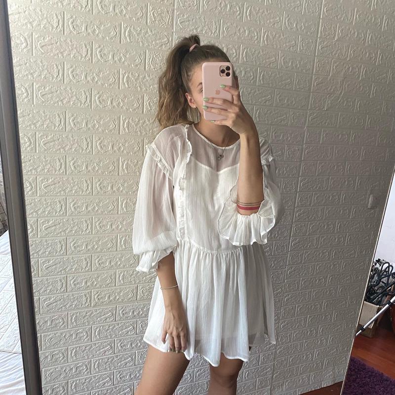 шифонова сукня ZARA молочного кольору із золотими вставками є підкладка не просвічується розмір М, але підійде на і на S довжина 67 см параметри на фото: 175 см, 86-70-98