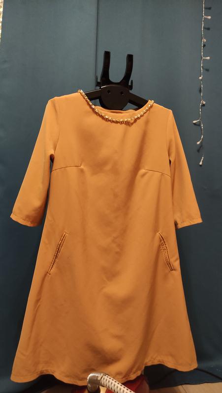 Очень красивое платье силуэта трапеции. Украшено вшитым ожерельем. Длина чуть выше колен на рост 159 см.