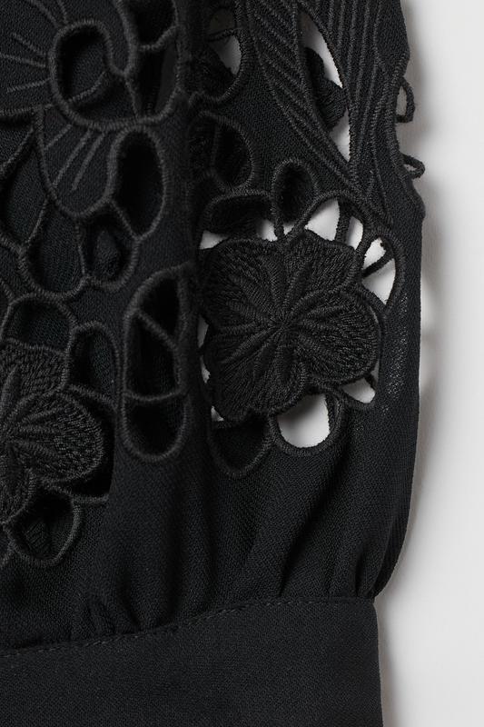Платье до колен из тканого материала. Круглый вырез и вырез сзади на потайной пуговице. Кокетка сзади со складками и длинными рукавами-баллонами с узкими манжетами.