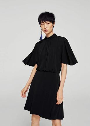 Платье мини чёрного цвета mango Струящаяся ткань, американская пройма, рукав в виде макси-волана, сзади застежка на молнию. Длина платья: 94,5 cм. Ткань немного тянется. Размер S Надевался на съёмку один раз.