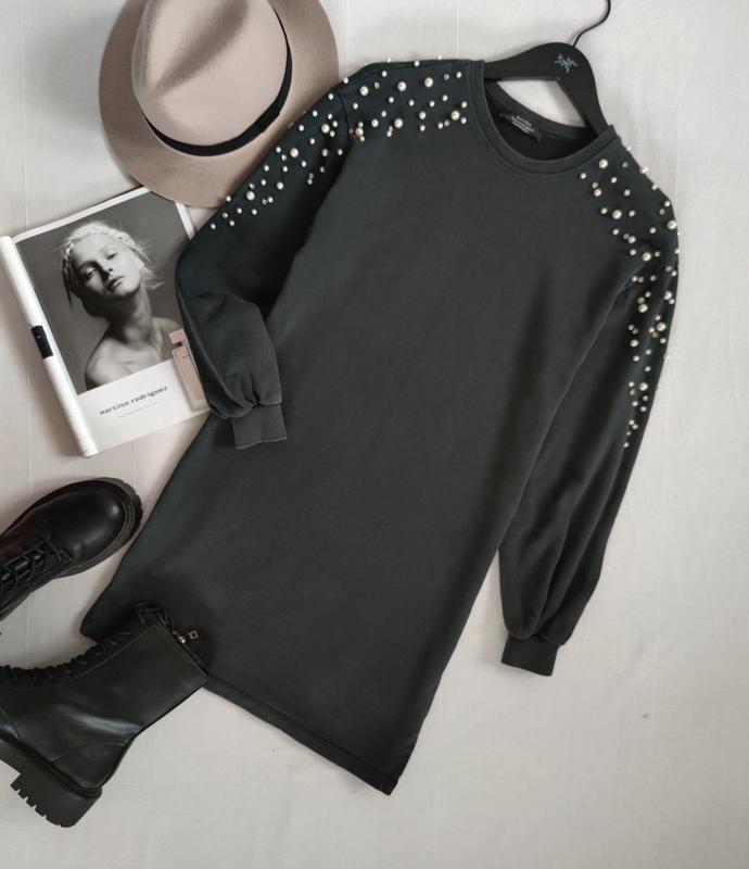 Сіре плаття- світшот від Bershka доповнене перлами, тканина котон, крій вільний, розмір XS, ПО грудей 46 см, довжина 84 см
