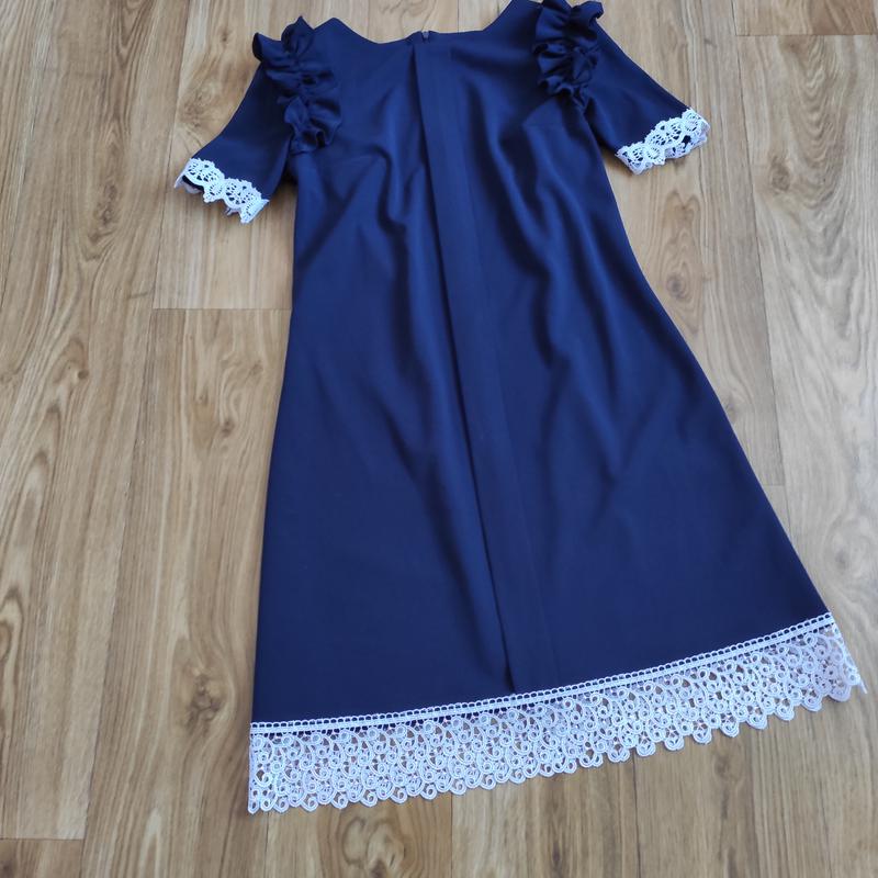 Красивое нежное платье с белым кружевом по низу и рукавах, прямого крою. Ткань: креп (тягнеться + 3,4 см.) Розміри 44 - 46 Цвет : темно-синій