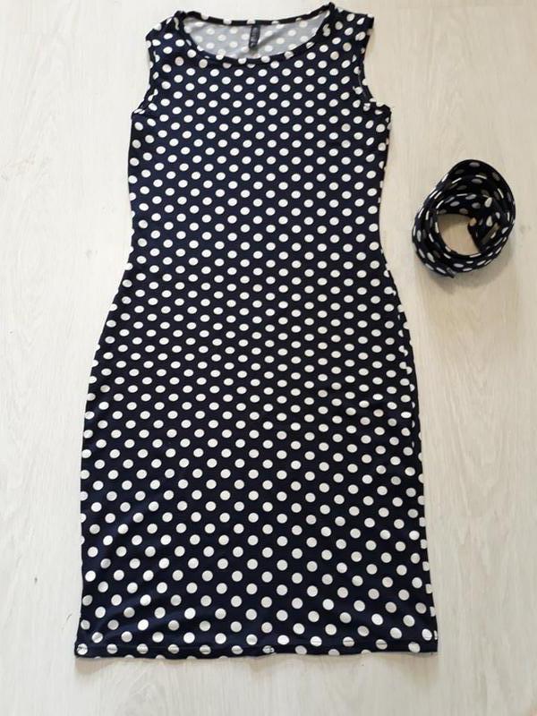 Платье/сарафан в горошек с поясом (бирка отсутствует), 100% полиэстер. Замеры: ОГ-80, ОТ-68, ОБ-94, плечи-35 см, длина-87. Ткань хорошо тянется. Без изъянов. Пересылка по предоплате. Смотрите другие объявления в моём профиле-много качественных вещей по низким ценам.