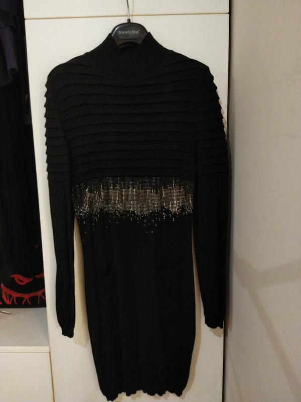 трикотажное, короткое, стразы и два кармашка спереди, длина 93см