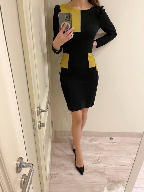 Стильна та елегантна жіноча сукня. Прикрашена гірчичними вставками, які візуально підкреслюють талію. Довжина сукні 95 см. Сукня нова. Розмір 36-38