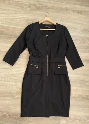 Чёрное платье, рукав три четверти, ткань плотная, ложиться платье по фигуре. Состояние очень хорошее, размер на 46/48 или ml