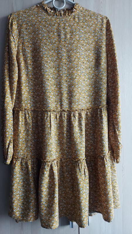 Ярусное горчичное платье в цветочный принт fb sisrer Размер XS Состав: 100% вискоза ПОГ - 45см ПОТ - 42см Рукав - 56,5 см Плечи - 36см Длина - 85см