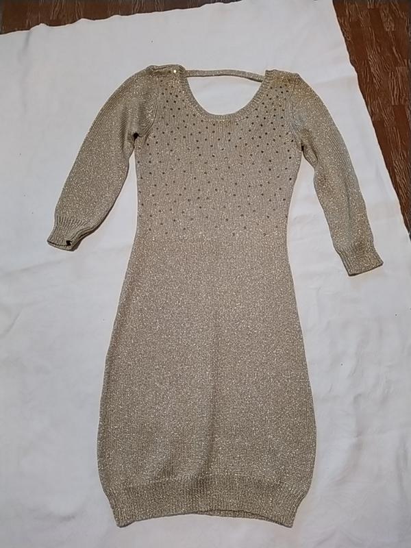 ткань трикотаж с люрексом,этикетку срезала,вискоза,синтетика и люрексовая нить. есть пару зацепок, см.фото - образовались при хранении, но это не спущенные петли-легко прячутся крючком на изнаночную сторону,не влияют на общий вид. очень хорошо тянется. сидит по фигуре чулком. вырез на спине позволяет носить обычный бюстгальтер,не слишком низкий. длина 90 см.