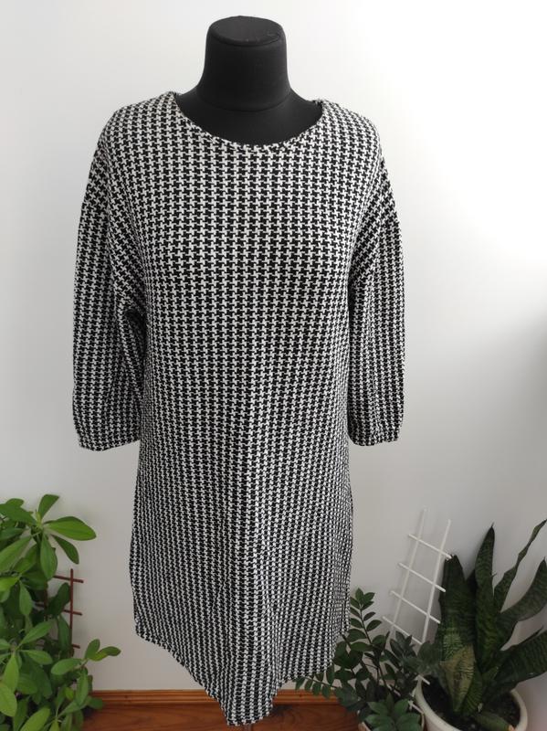 Офисное платье в "гусиную лапку" 14 р от tu Размер - 14 Цвет - черный, белый, принт гусиная лапка Материал - трикотаж Крой - прямой Рукав - 3/4, пышный на резинке Без подкладки Длина - 92 см Пог - 50 см Пот - 48 см Поб - 53 см Рукав - 36 см Плечо - 20 см