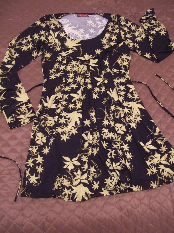 Платье черное в ярко-желтые цветы. Смотрится очень свежо. Завязывается под грудью