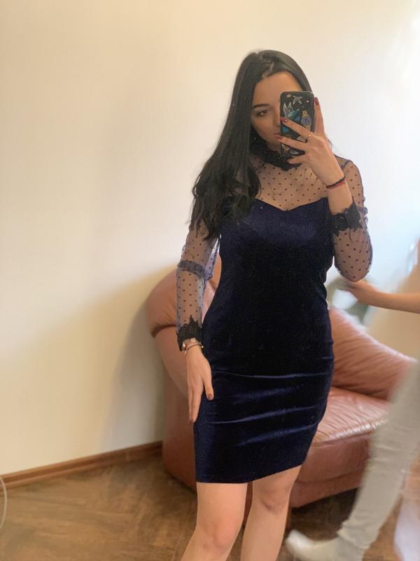 Красивое темно синее платье, на рукавах и декольте идёт сеточка, кружево на шее и руках. Велюр Мои параметры: ОГ 90 ОТ 69 ОБ 96 Рост 168