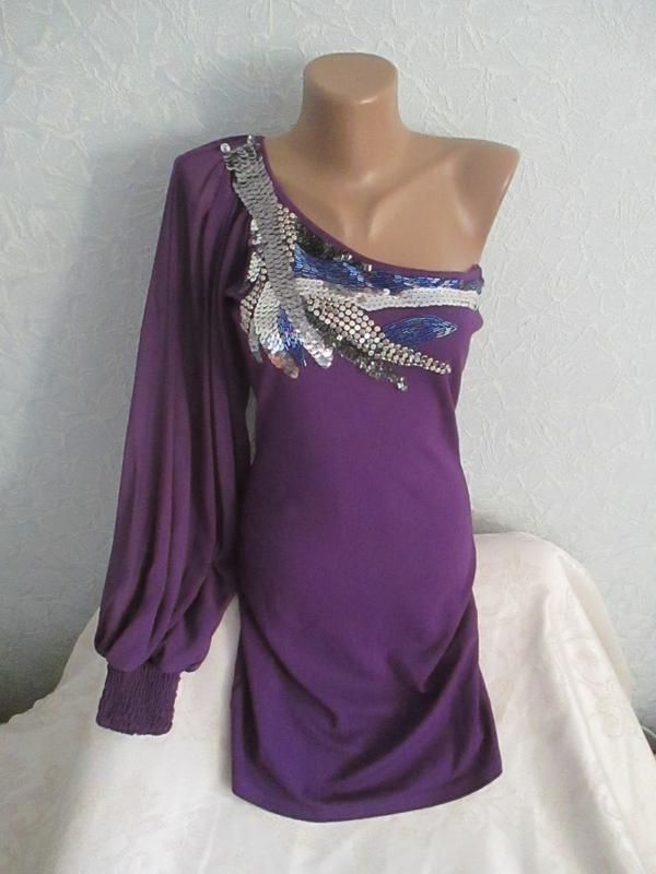Девочки, платье обворожительное, эффектное, оригинальное, насыщенно-фиолетового цвета на одно плечо с широчезным шифоновым одним рукавчиком на манжете ( с резинок ), спереди вышитым ажурным украшением из паеток ( круглых и квадратных ), бисера и металлических заклёпок. Смотрится сказочно-красиво, эффектно и отличнейше подчёркивает фигурку! Размер указан 10\38, наш 42-44, замеры: длина от плеча 85 см, ПОГ 40 см ( ОГ до 88 см ), ПОТ 35 см, ПОБ 42 см, рукав сверху ( от горловины ) 75 см ( вместе с манжетом ), снизу 63 см. Ткань, состав: 67% вискоза, 28% полиэстер, 5% эластан, приятная, плотная, немного тянется. Бренд - Quiz. Спрашивайте, пожалуйста, крутое и шикарное платье, будете выглядеть в таком всегда оригинально и эффектно! Доставка УП ( + 25 грн. ) или НП;-)...
