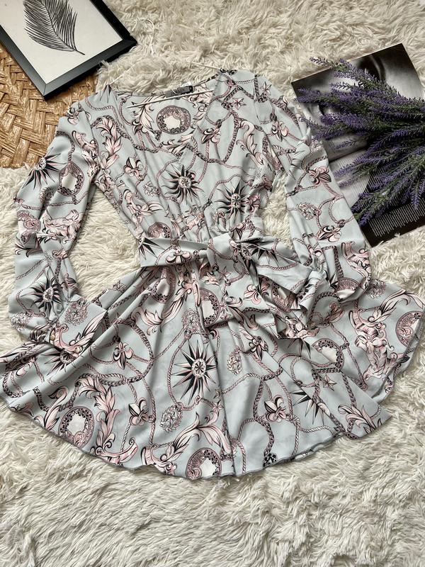 Продаю новые вещи по низким ценам. Смотри мои объявления. Шикарное платье с пышными рукавами из шелковистой качественной ткани. Модный принт в идеальном сочетании серого и нежно-розового. Талия на резинке РазмерСМ Длина: 75 см Рукав: 62 ПОГ 40 см
