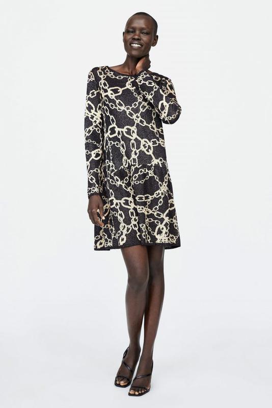 Оригинал из Европы . Размер S, можно на M ., см.замеры ОГ 52 см . ОБ 54 см . длина 91 см . Трикотажное платье выше колена с длинным рукавом и золотистым узором цепи : - Расширенный крой, отрезное ниже талии - мягкий плотный трикотаж с люрексом индиго по фактуре - вживую намного красивее и богаче Цвет : черный / золотистый